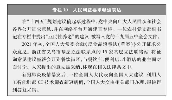 图片来自《中国的民主》白皮书白皮书中提及,“十四五”规划建议起草过程中,党中央向广大人民群众和社会各界公开征求意见,并在网络平台开通建言专栏。这是五年规划编制史上首次开展“网络问计”,当时在上百万条网民意见建议中,一位叫“云帆”的网民通过人民网“领导留言板”留下关于“互助性养老”的建言:“在农村人口聚集区域,由政府财政投入建设公共食堂、公共宿舍……形成互助养老模式。”最终,这条建议有关内容被列入“十四五”规划建议,化为规划纲要的具体举措。