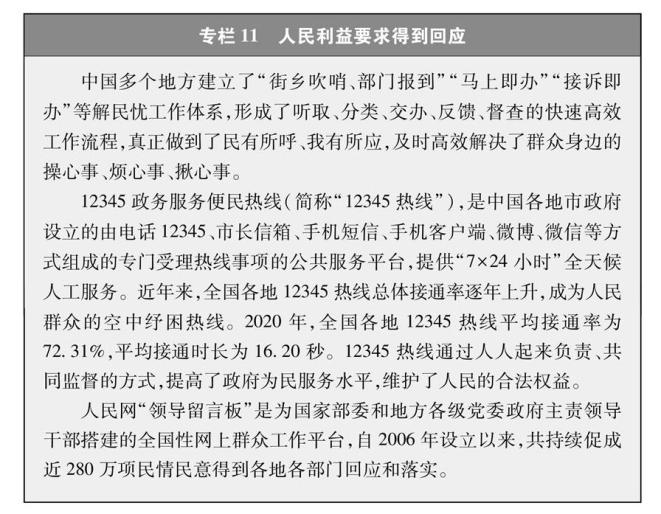 国务院新闻办4日发表《中国的民主》白皮书。其中在第四部分“广泛真实管用的民主”提及“人民民主参与不断扩大”时,白皮书以人民网“领导留言板”和12345政务服务便民热线为例对“人民利益要求畅通表达、得到回应”进行介绍。