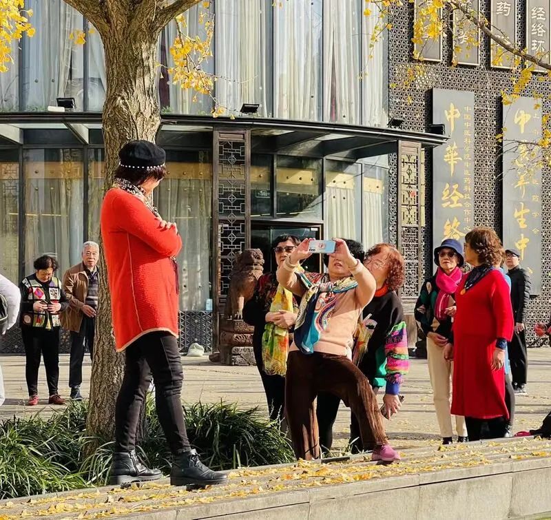 这周六,邱阿姨拉着老伴去古北黄金城道看银杏树,只见人潮汹涌,一路上都是用手机拍照、拍视频的阿姨爷叔。女的丝巾贝雷帽,男的墨镜长风衣,不少老人还现场玩起了在线直播,手势、腔调一点不输年轻人。有位穿着红色长裙、头发灰白的老阿姨旁若无人地站在台阶上摆出孔雀舞造型,邱阿姨的老伴忍不住点评:“这是古北杨丽萍。”邱阿姨撇了撇嘴:“她是要发抖音吧。”