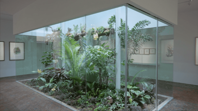 走进这个小美术馆,处处通透,看画也看花。在曾孝濂的花鸟新作旁,隔几步,就被各种热带、温带植物环绕。