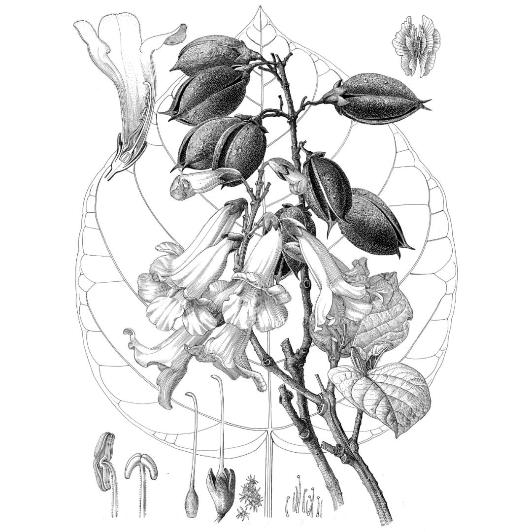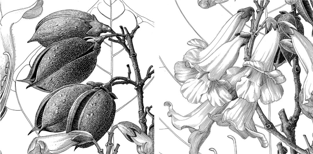 泡桐科学插图整体和局部 绘于1976年退休前,曾孝濂是中科院昆明植物研究所的教授级画师、工程师,中学毕业进的所里,“择一事终一生”——为植物画画。最大的成就,是参与《中国植物志》的编撰。