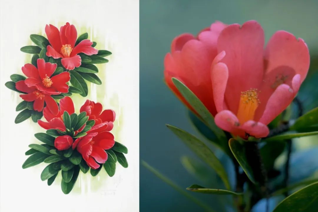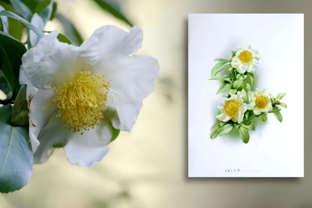 最近的新作长果大头茶(右)与实物还有一次,他兴冲冲跑到植物园里采标本,意外看见野生的长果大头茶开得那么好,于是就坐下来画起了速写……
