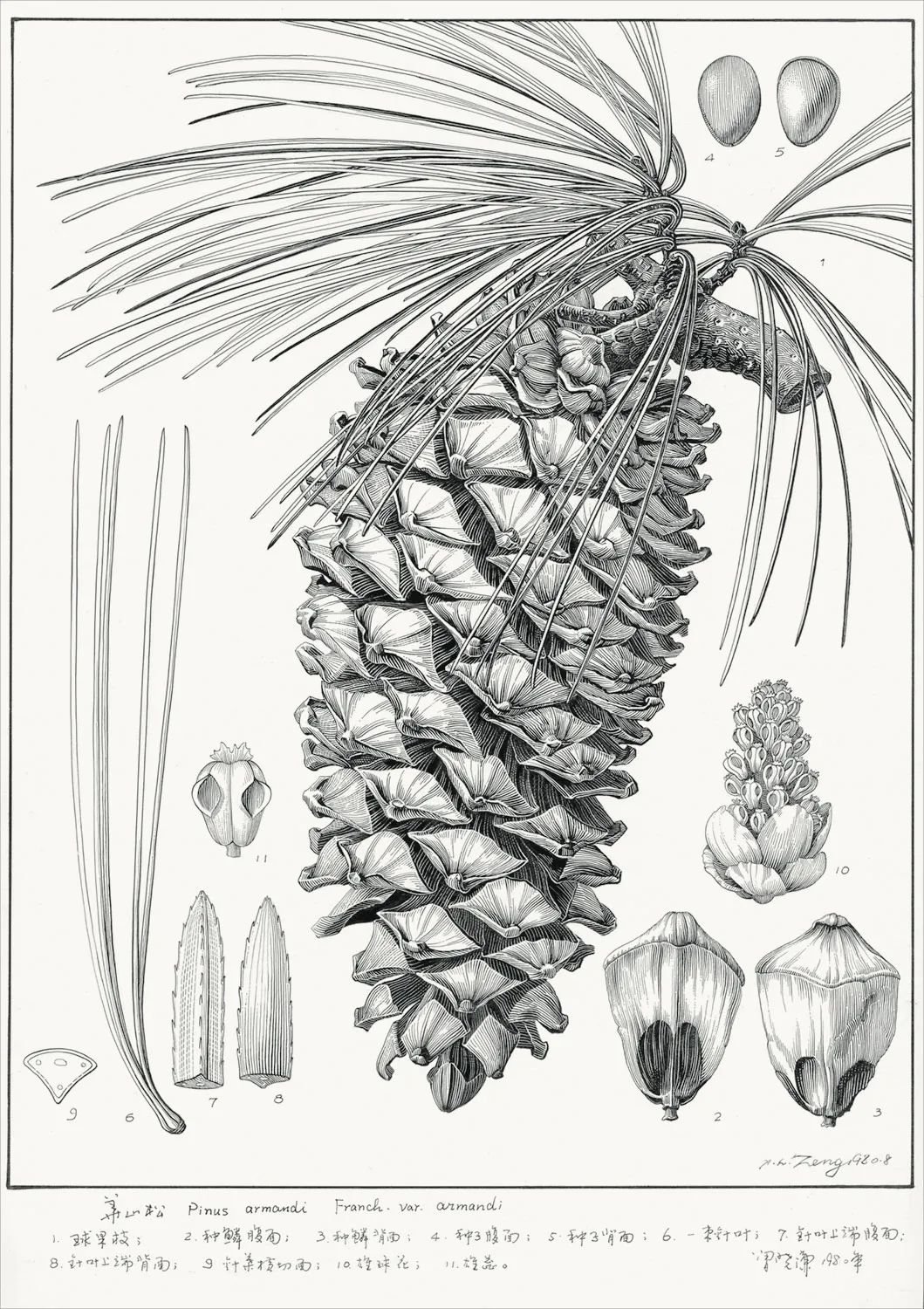 华山松科学插图 1980年这种植物科学插图,文艺复兴时期的大画家、科学家达·芬奇就画过,后来成为西方植物学专业的传统。在我国,最早由“生物绘画祖师爷”冯澄如在上世纪20年代引介,带出了第二代中国科学画师。