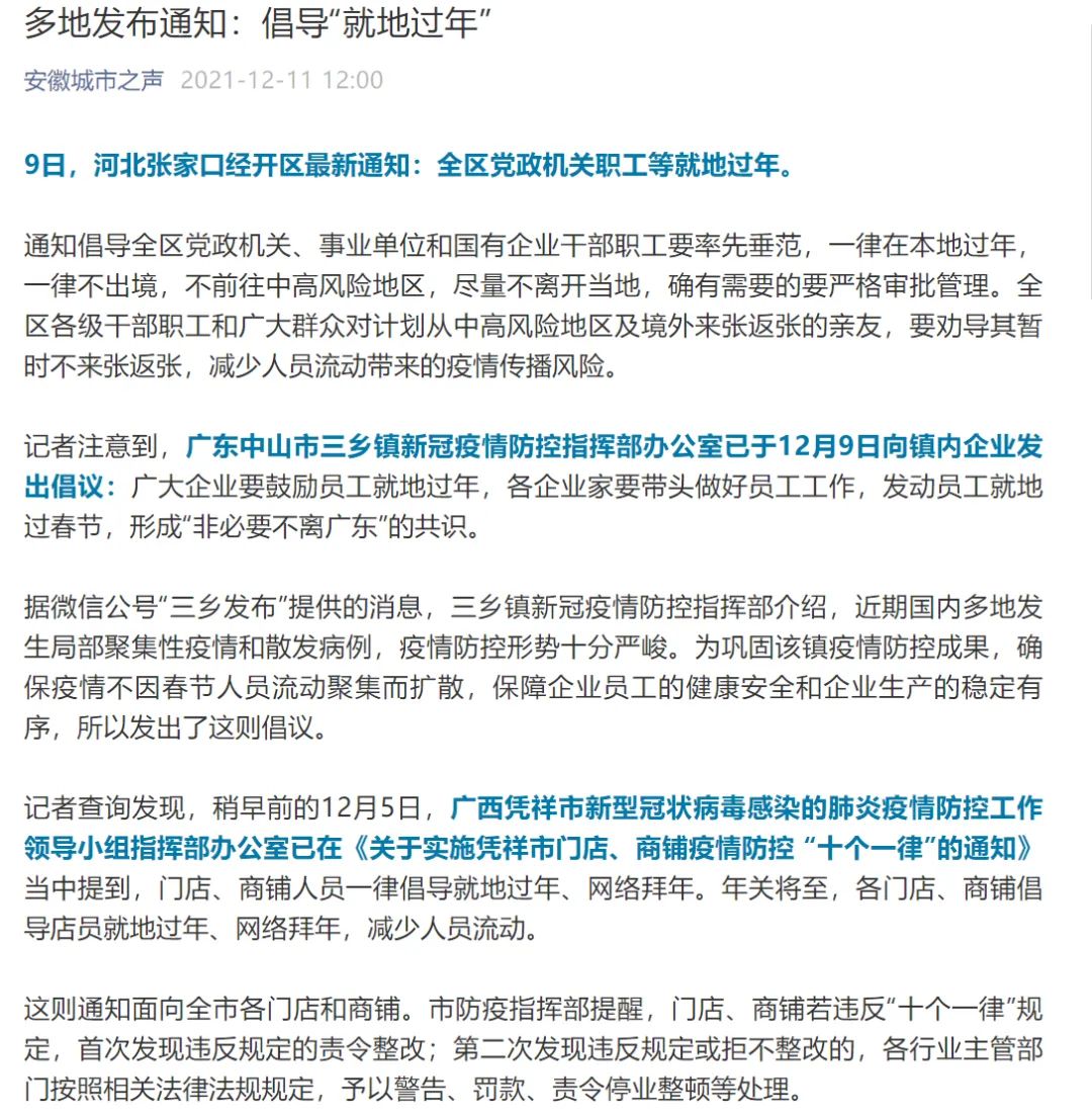 近日河北张家口、广东中山市、广西凭祥市等多地发布通知,倡导就地过年、网络拜年,减少人员流动。