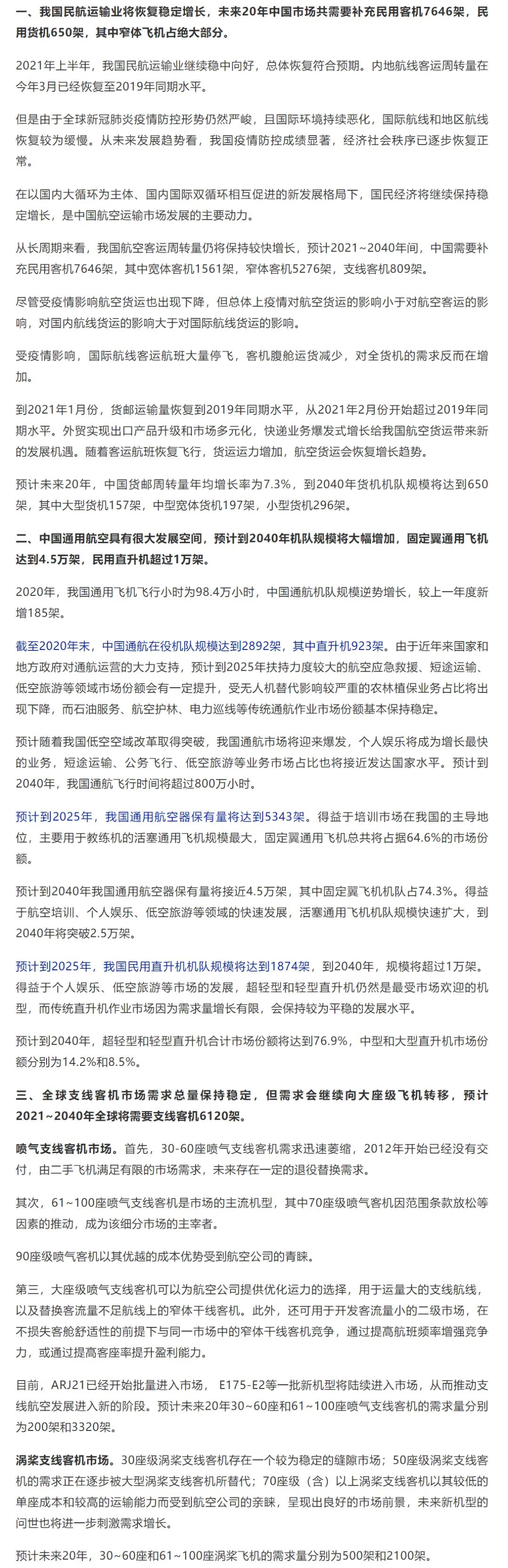 中国航空工业发展研究中心10日在北京发布了《民用飞机中国市场预测年报(2021~2040年)》和《通用航空中国市场预测年报(2021~2040)》。年报披露,未来20年中国市场共需要补充民用客机7646架,民用货机650架,其中窄体飞机占绝大部分。