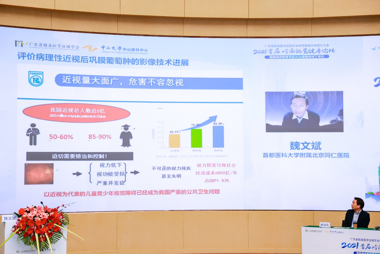 广东省人民医院余洪华教授、广州医科大学附属第一医院程浩教授、中山大学附属第一医院万鹏霞教授主持近视群体防控发展方向单元。清华大学信息技术中心钟晓流教授对国家高度重视的信息化教学环境视觉设计的注意事项与操作细节进行了详细介绍,首都医科大学附属北京同仁医院魏文斌教授介绍了病理性近视后巩膜葡萄肿的影像技术新进展,中山大学中山眼科中心林浩添教授对于利用卫星遥感技术探索校园绿化率与青少年近视进展的相关关系研究成果做了精彩的分享,上海市眼病防治中心何鲜桂教授分享了屈光发育档案建立的综合管理与儿童高度近视早期管理的遗传机制和早期干预。中山大学孙逸仙纪念医院蓝育青教授、北京大学深圳医院李金瑛教授、中山大学附属第六医院夏朝霞教授、广州医科大学附属第五医院周少博教授参与嘉宾讨论环节。