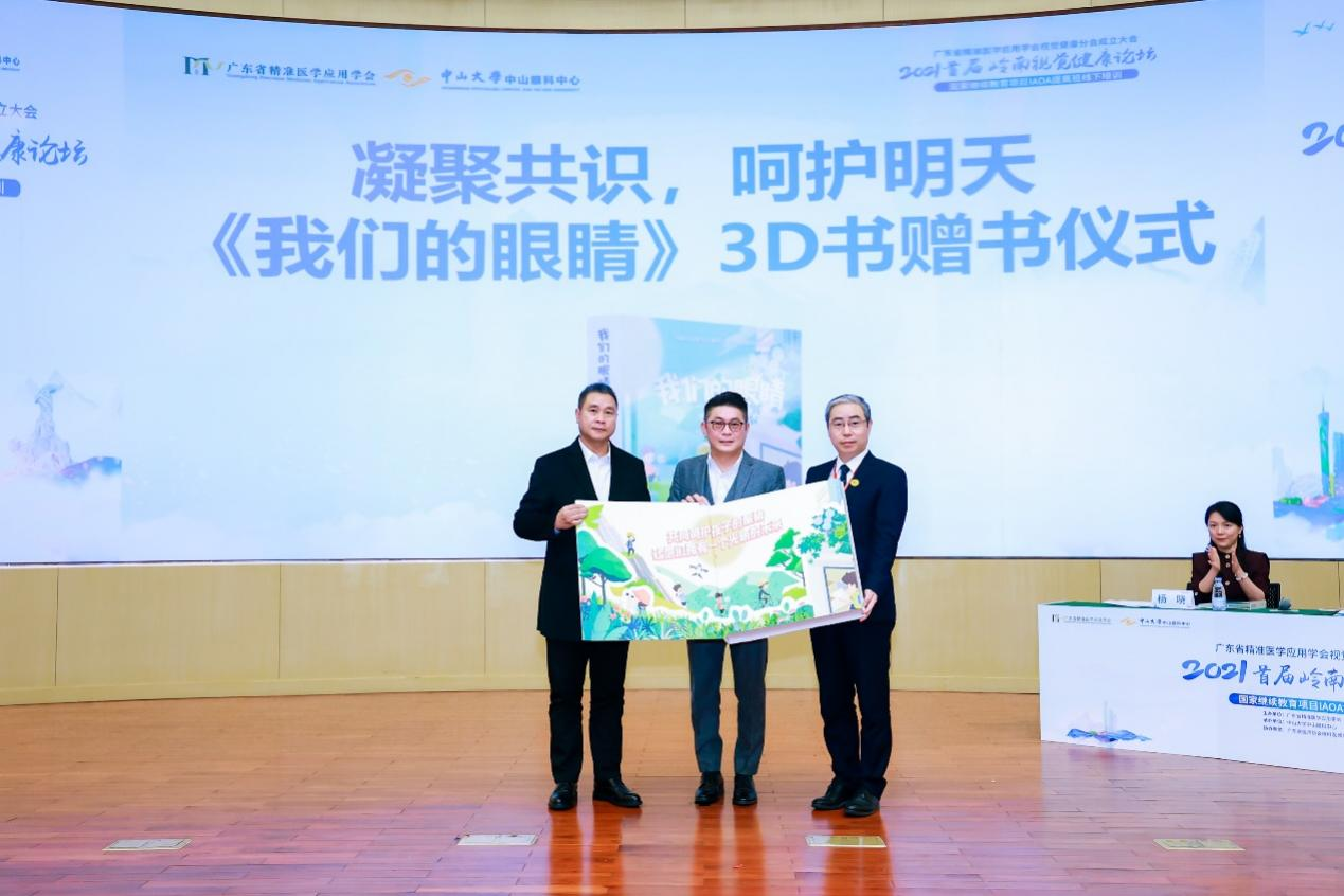 中山大学中山眼科中心杨晓教授、深圳市眼科医院崔冬梅教授、广东医科大学附属第二医院叶亲颖教授主持凝聚共识,共同主持凝聚共识,呵护明天学术时段。与会专家还对亚洲眼视光执业管理协会(AOMA)做出了简单介绍,并就《视力残疾康复服务团体标准》和《亚洲近视管理共识》予以详细解读与现况分析,依视路集团林国樑先生作“共识、规范、触达”演讲。广州市眼镜行业商会会长何锦泉董事长、依视路大中华区视力保健部林国樑总裁、广东省精准医学应用学会孙炳刚副会长出席“呵护明天”3D书赠书仪式。