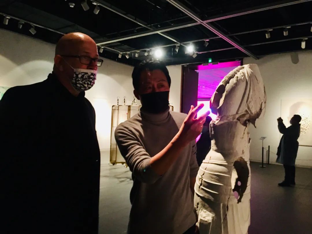 艺术家刘军(左)在作品前与嘉宾交流天津美术馆馆长马驰在《三十年,一个轮廓》一文中阐述了此次“卅望春东——程昕东当代艺术作品收藏展”的意义: