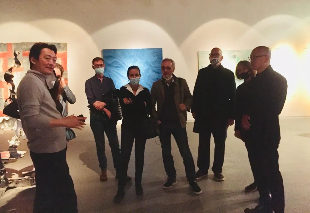 展览现场收藏家程昕东(左一)为嘉宾介绍展览作品