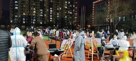 学生们自觉地间隔一米排着长队等待检测。中小学生核酸检测进行得很顺畅,幼儿园由于孩子小,核酸检测进行得慢一些。争取在13日凌晨完成检测取样工作。