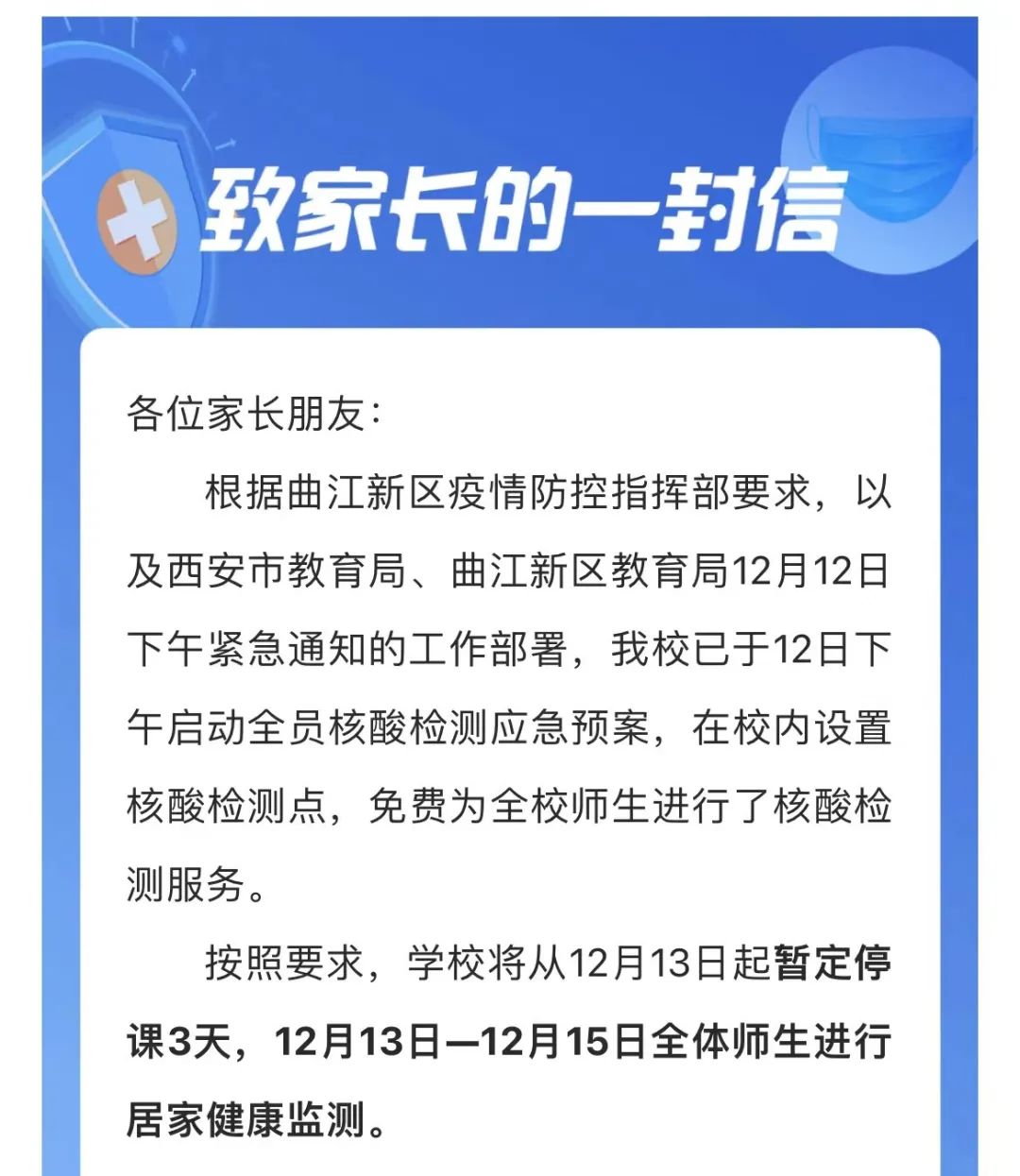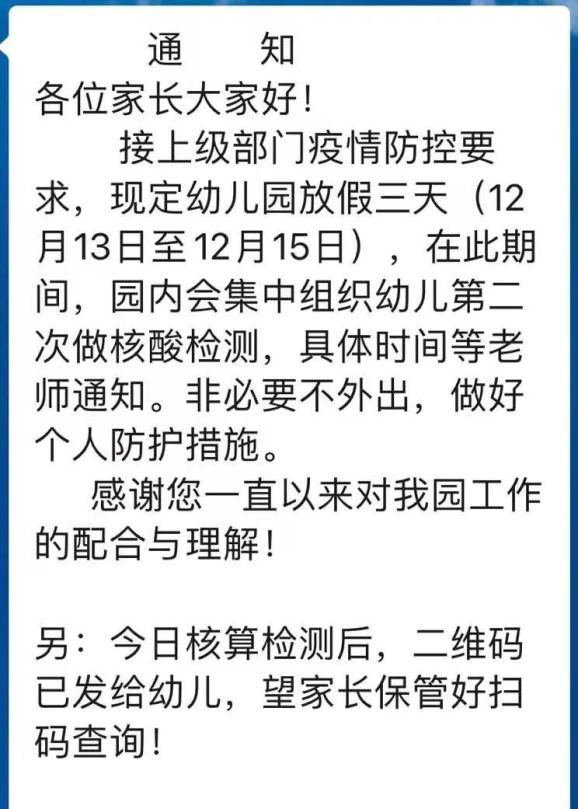 按照要求,学校将从12月13日起暂定停课3天,12月13日—12月15日全体师生进行居家健康监测。