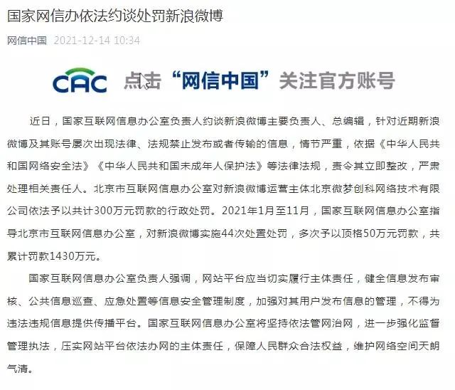 2021年1月至11月,国家互联网信息办公室指导北京市互联网信息办公室,对新浪微博实施44次处置处罚,多次予以顶格50万元罚款,共累计罚款1430万元。