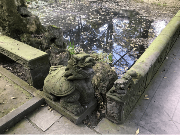一对身披青苔、雕刻精美的石头龟甲龙镇守在小桥桥头上,龙头龙角龙须龙睛栩栩如生。