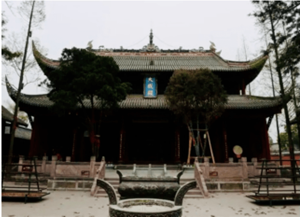 该文庙用材大,气势雄伟,为郫都区仅存的最大一处木结构古建筑。殿顶为重檐歇山式,上施琉璃瓦,脊上有较繁复的堆雕等装饰。