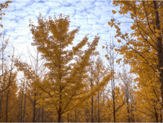 老城墙背后有一大片银杏树林,树林旁边有一个茶馆。在冬日里,人们边喝茶晒太阳边赏银杏,真是惬意极了!棵棵银杏树张开金黄色的臂膀,频频向蓝天白云亲密致意,把古镇烘托得美不胜收!