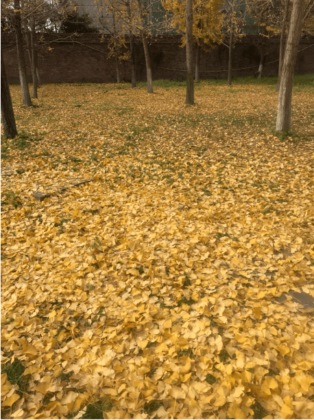 随着阵阵冷风吹过,银杏树叶纷纷飘落下来,给古镇一隅的地面镀上了一层金。