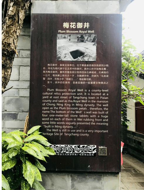 唐昌古镇小南街内有一条梅花御井巷,梅花井为明崇宁王朱悦燇王府御井。其水色清冽,水味甘醇,水质优良,有古井御梅花之称。