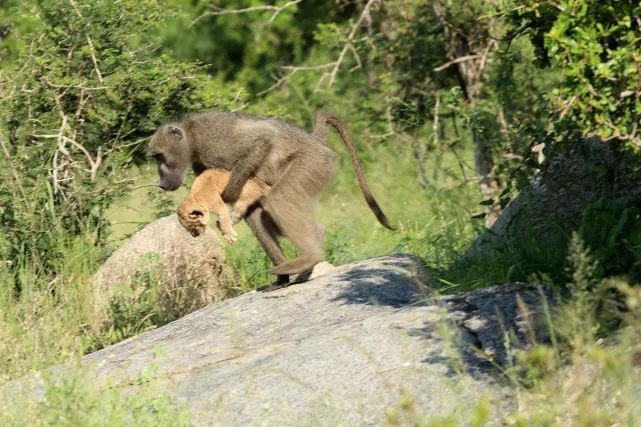 一阵梳洗后,狒狒抱着小狮子消失在人类视野中。
