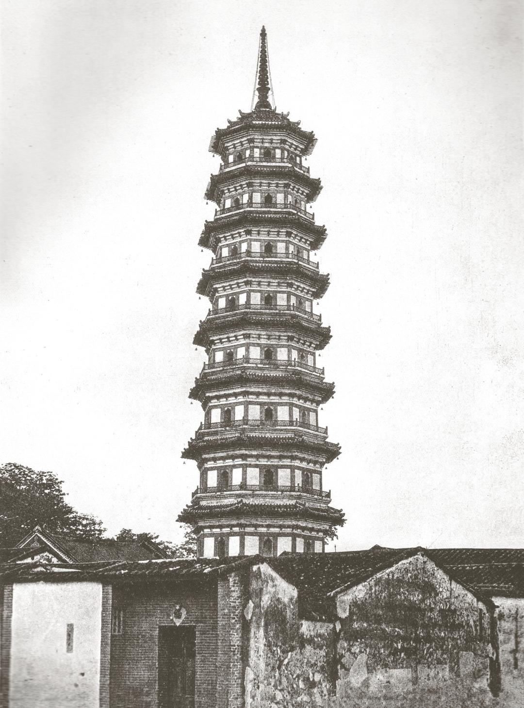 ▲广东广州的花塔。为八角层塔,外带回廊。初建于公元500年,现存式样大约建于明代