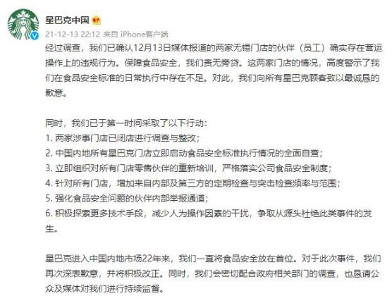 @星巴克中国 12月13日晚发布消息:经过调查,我们已确认12月13日媒体报道的两家无锡门店的伙伴(员工)确实存在营运操作上的违规行为。保障食品安全,我们责无旁贷。这两家门店的情况,高度警示了我们在食品安全标准的日常执行中存在不足。对此,我们向所有星巴克顾客致以最诚恳的歉意。