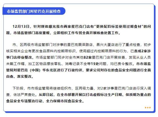 “无锡市场监管”微信公众号12月13日晚发布公告,针对媒体曝光无锡市两家星巴克门店有“更换配料标签使用过期食材”的问题,市场监管部门高度重视,当日立即组织工作专班全面开展核查处置工作。市、区两级市场监管部门对涉事的星巴克震泽路店、昌兴大厦店进行了重点检查,初步核实相关企业有更改食品原料内控期限标识、使用超过内控期限原料的行为,已责成2家涉事门店停业整改。市场监管部门同步对全市其他82家星巴克门店开展排查,发现从业人员未戴工作帽、加工区物品摆放零乱、消毒记录不全等15处问题,均已责令整改。市市场监管局对星巴克(中国)华东北区进行了行政约谈,要求公司对存在的食品安全问题进行全面自查、落实整改。
