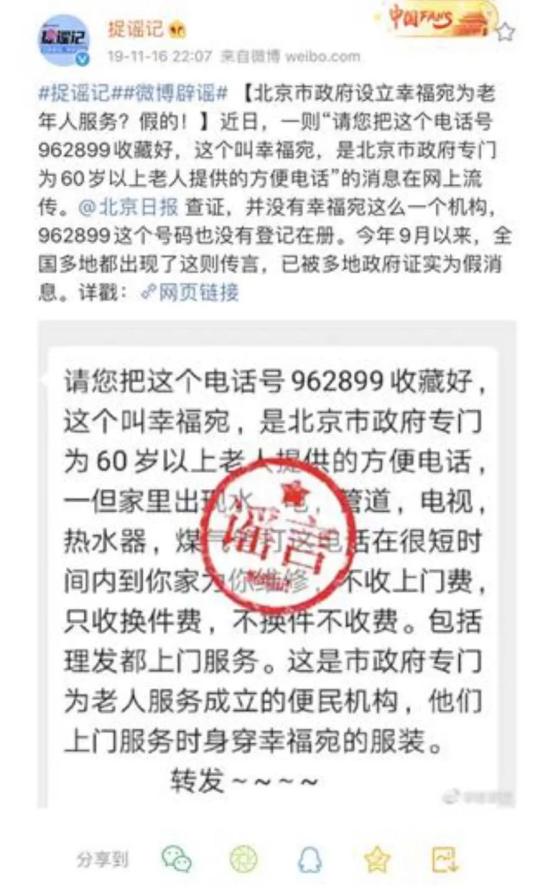 记者搜索网络发现,所谓“幸福宛为老人提供免费服务”的谣言不仅出现在上海,也曾在北京、石家庄、哈尔滨、南京、西宁、成都、昆明等多地传播,相关地区也进行了辟谣。