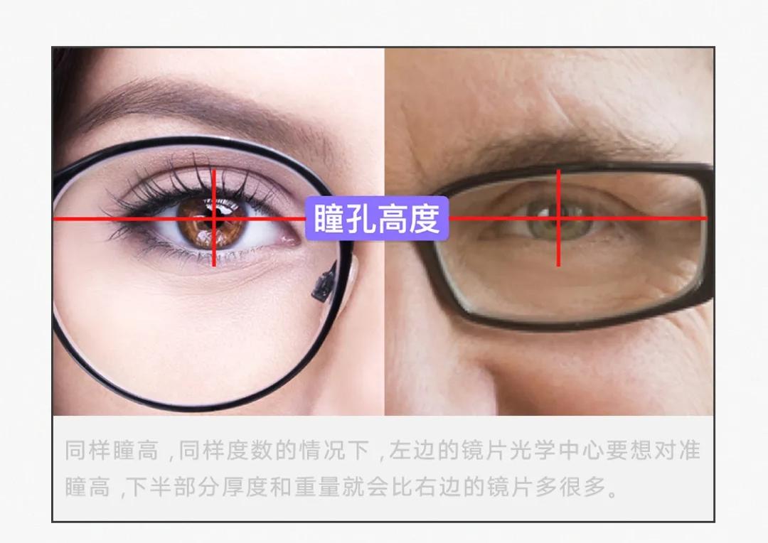 为什么呢?大家都知道凹透镜片是中心薄周围厚,度数越高镜片就越厚。镜框必须要匹配我们的瞳高,一旦选择了大镜框,就意味着镜片边缘的厚度和重量都要相应增加,非常不利于日常的佩戴。