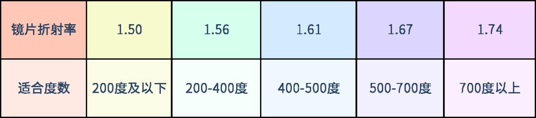 以上所列的折射率并不是全部,不同的镜片品牌可能会有差异。有些品牌干脆就不生产1.60以下折射率的镜片,有些品牌还会制作1.71、1.76等折射率的产品。根据你的度数,可以考虑选择相对应折射率的镜片。这里小编给大家提供一个选择方法↓↓