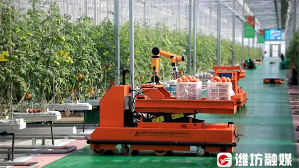 现代化蔬菜大棚里的采摘机器人。