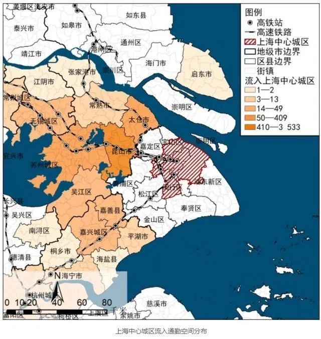 其中,苏州城区的跨城通勤人群主要以高铁通勤为主,昆山花桥地区的跨城通勤人群以地铁为主,而太仓地区以私家车通勤为主。此外,上海地区也有人群到周边城市上班,其主要工作地为昆山市、太仓市和嘉善市。