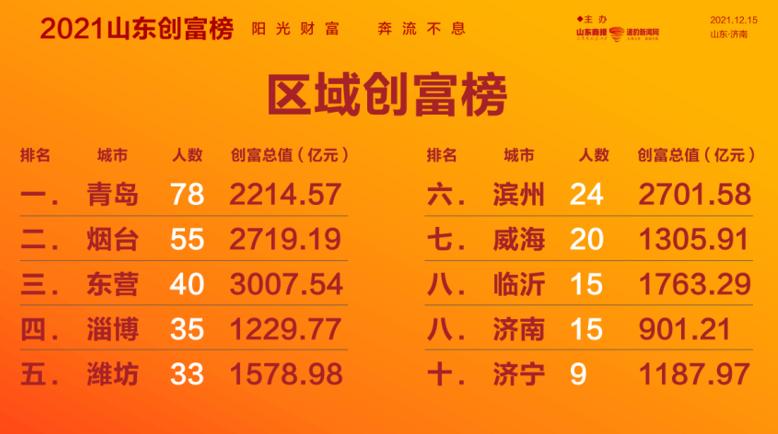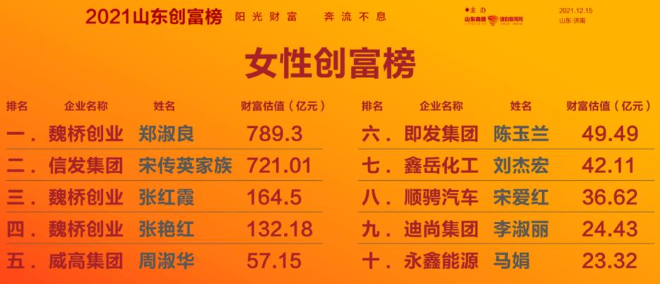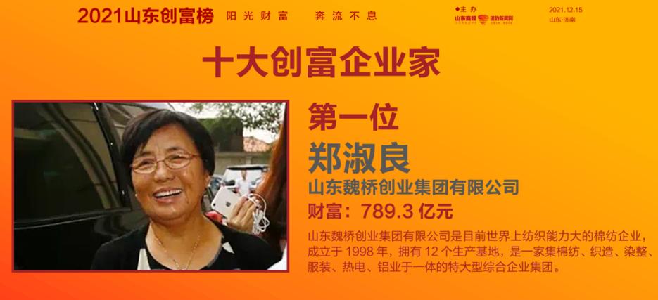 原标题:《2021山东创富榜发布!魏桥郑淑良全省第一,16市第一分别是他们》
