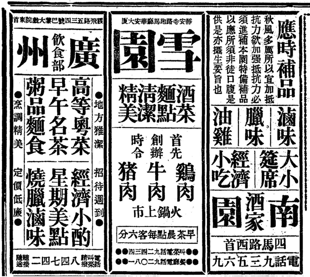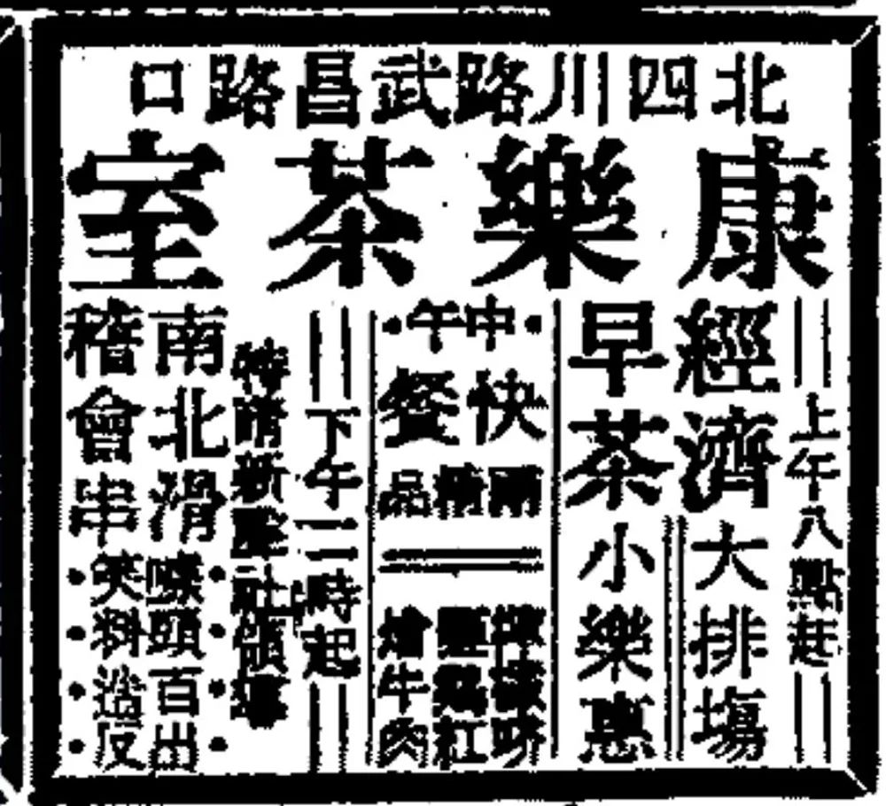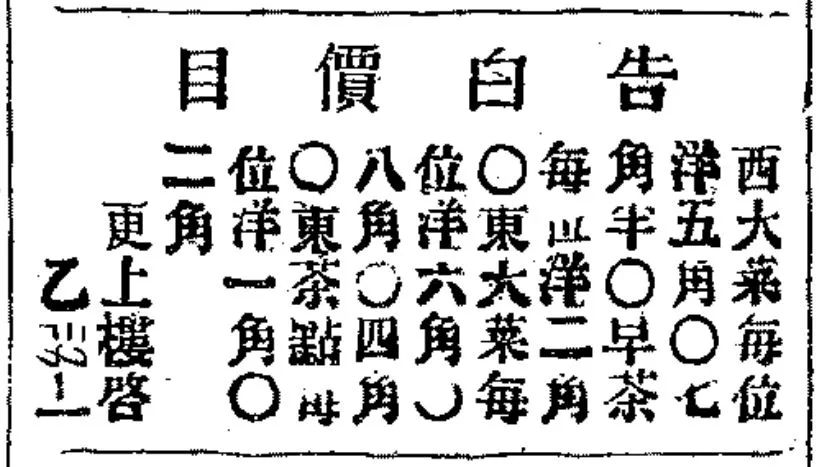 1880年8月16日《申报》刊发的更上楼告白价目,其中“早茶每位洋二角”广东路河南路口的同芳居、怡珍居是较早开设的广式茶楼。同芳居兼售茶食糖果,一大清早有鱼粥供应,晌午前都有蒸熟粉面和各色点心供应。20世纪初,随着南京路市面日趋闹猛,广东茶馆盛极一时,单是从南京路到西藏路一段,就有居安居,陶陶居,大东,大三元,东亚,新雅等近十家,此外较为有名的茶楼还有小壶天、广东楼、安乐园、西湖楼等。20世纪20年代,随着虹口地区内广东人越来越多,他们开设的商号也逐渐增多。除北四川路上的新亚大酒店外,武昌路上的“元兴园”“同华春”都曾是当时上海颇有名气的粤式茶楼食肆。