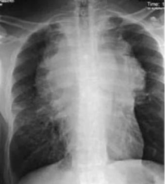 5、巨大肿块形:单侧或对侧,致密,外带密度逐渐减低,占据整个上肺野及部分中肺野,下缘清晰锐利,外缘模糊。如下图8所示。