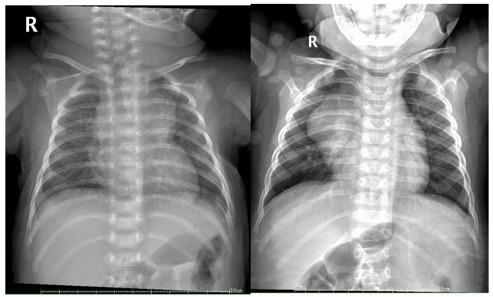 图2示:左侧胸片为右上肺炎征象;右侧胸片示胸腺影