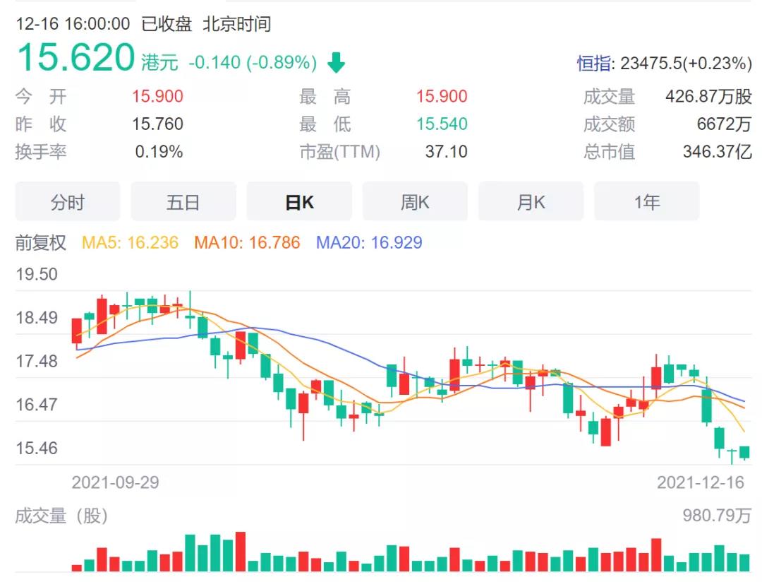12月16日,同程艺龙收报15.62港元/股,跌0.89%,总市值约346亿港元。