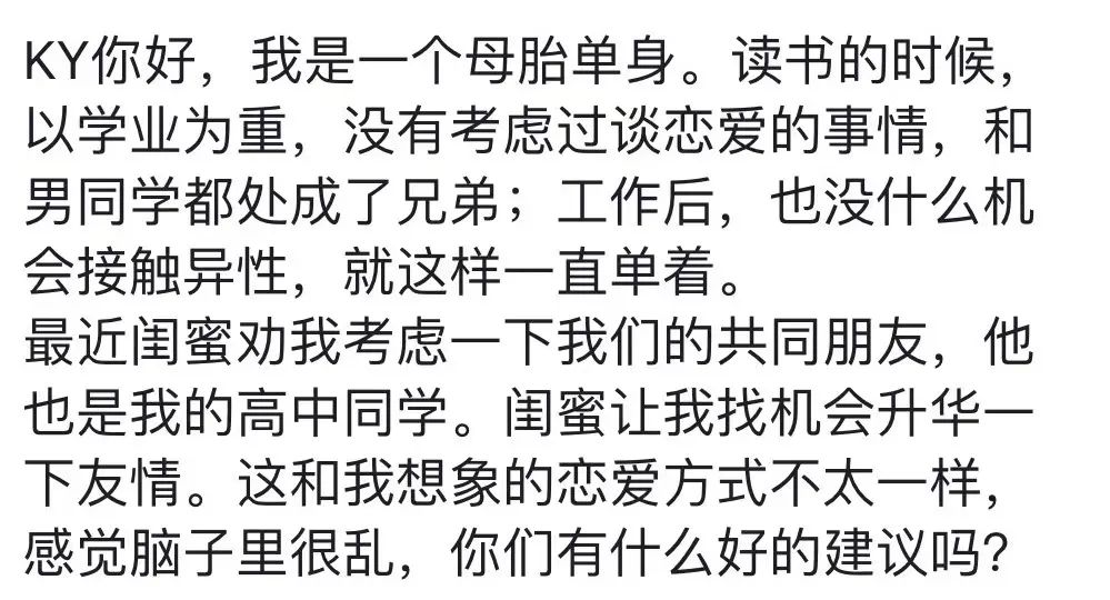 很多时候,好朋友无法发展成恋人的原因是,在这份亲密关系里,个体对于亲密的需要没有得到足够的满足,比如缺少激情和欲望。只有当个体在亲密关系中的大部分需求都能在一个人身上得到满足时,ta才有足够强的意愿把友情转化成爱情。
