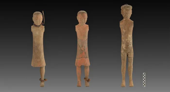 在对外藏坑的考古发掘中,考古人员首次发现了刑徒俑。这些刑徒俑的脖子、手腕以及脚踝上都有着铁环状的刑具,象征着在修陵时征发的各种徭役。陕西省考古研究院助理研究员朱晨露指着一个陶俑对记者说:“你看,这件女性陶俑脖子上戴有铁钳,头上没有发髻,是一个光头形象,这就是受了髡刑。”