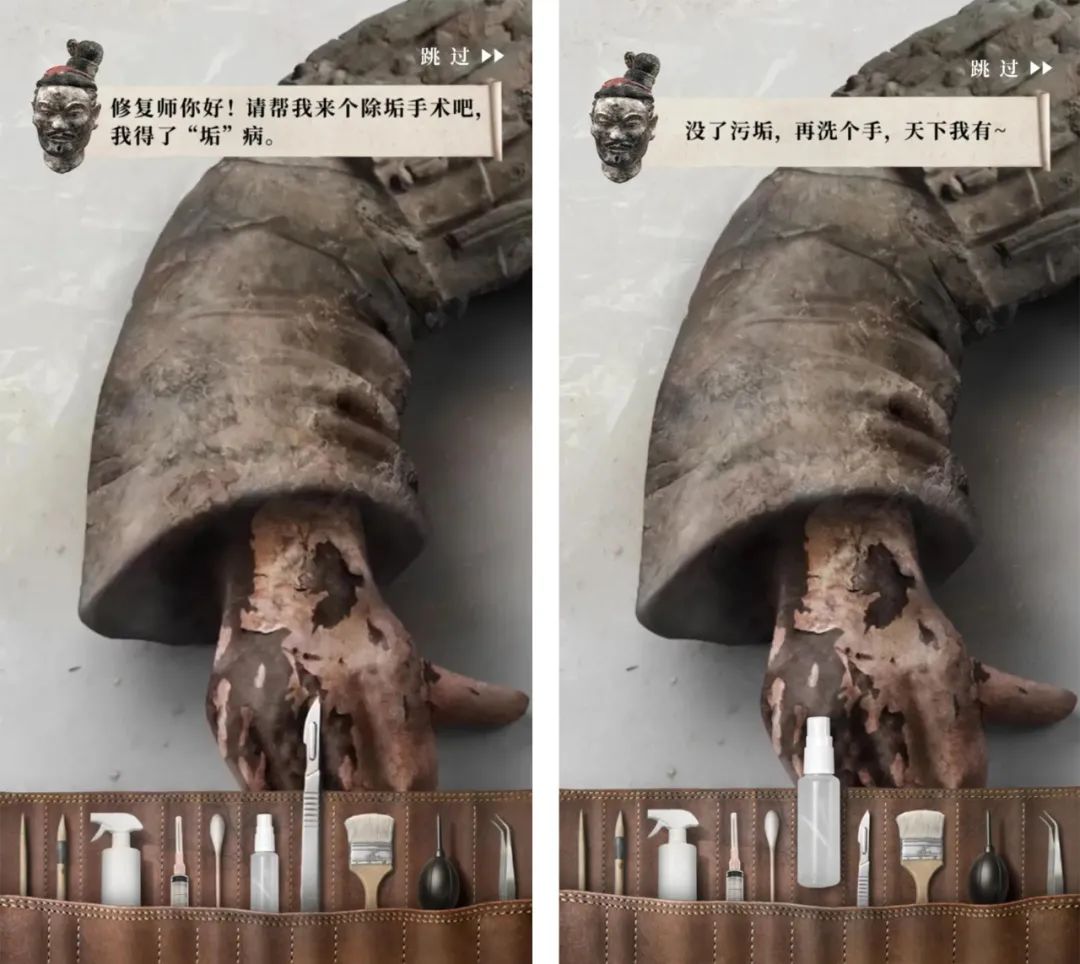 而在技术上也有创新,过去都是平面动画这种单方面的内容输出,走到了新的阶段就是技术带来的丰富交互形式。腾讯公益去年推出的《我在秦陵修兵马俑》H5中,用户可以跟着手机屏幕,体验各种道具对兵马俑进行修复,这种切身的体会更让人领悟到文化之美。