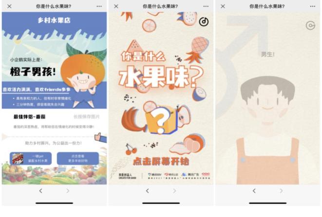另一个获奖的互动类H5案例《你是什么水果味》,则是在社交端,通过年轻人喜闻乐见的人格测试类游戏,通过“个体水果味”的定格,顺势引导至相应的水果购买,通过实际购买行动的召唤,直接助力“共同富裕”的大梦想。