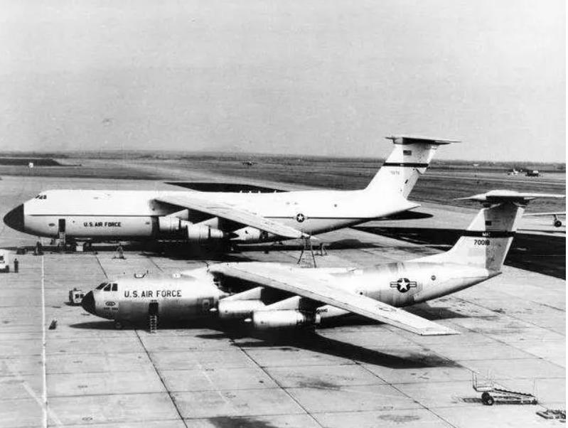 1973年第四次中东战争中,向以色列运送补给的美军大型运输机,C-141(近)和C-5A(远),在C-17服役之前,这三款运输机承担了美军几乎所有的战略运输任务