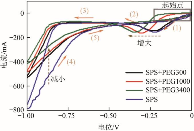 对于聚醚类添加剂来说,位阻效应是作用的主要方式,因此分子量是影响其作用效果的重要因素之一,张震等的研究表明NP(EO)n吸附层亲水链长度越长,对Cu2+的阻碍程度越大,沉积层的形貌越佳。从电化学的角度看,Song等研究了不同PEG分子量对铜电沉积循环伏安曲线的影响(图12),可以看出随着PEG分子量增大,阴极峰电位逐渐负移,说明PEG增加阴极极化的程度随分子量的增大而逐渐增强。