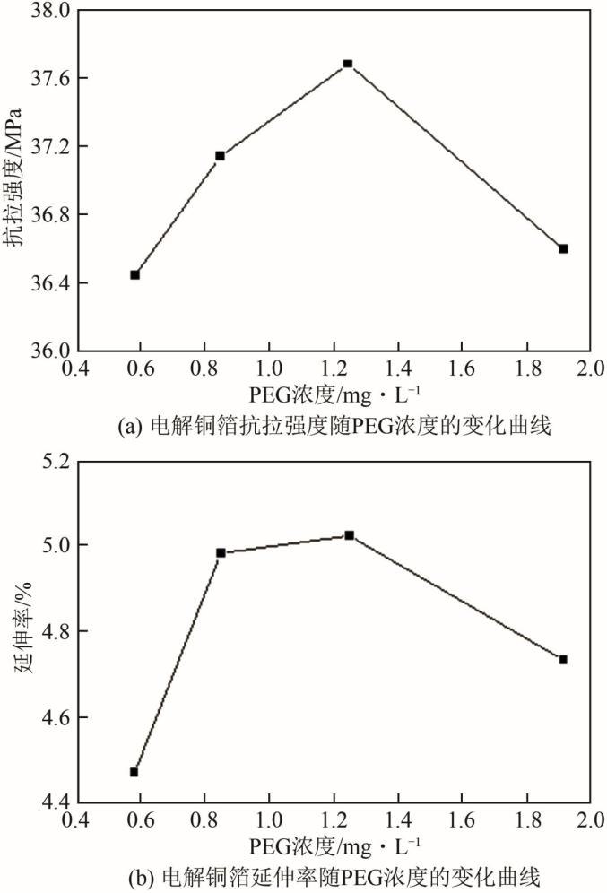 图13 电解铜箔粗糙度随PEG浓度的变化曲线力学性能方面,通常在1.0~1.5mg/L的浓度附近出现极大值,如图14所示。说明加入适量的PEG有助于获得综合性能良好的电解铜箔。Wang等的研究证实,过量的PEG会导致添加剂分子自身聚集及相互缠结,难以与Cu+和Cl-吸附结合,从而减弱对铜离子沉积的抑制作用,并且PEG团聚体可能会留下空隙等缺陷,使铜层致密性下降,影响铜箔的力学性能。