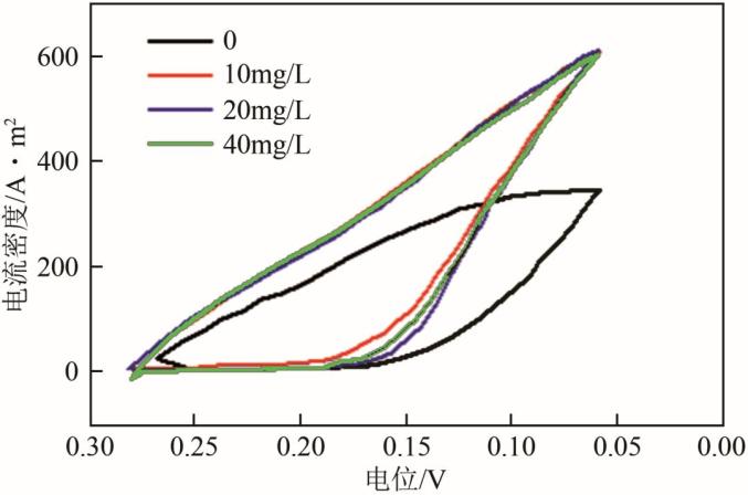 图15为不同Cl-浓度电解液的循环伏安曲线,相比无添加剂,存在Cl-时曲线斜率明显增大,即Cl-单独作用且浓度小于40mg/L时,使电化学反应发生去极化,并且作用程度近似。说明低Cl-浓度时其表现为加速作用,一定程度上有利于获得更致密的铜层。