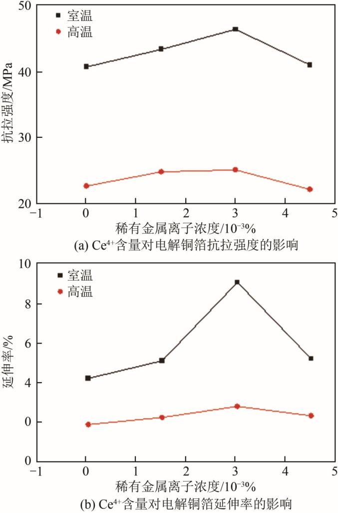 图16 Ce4+含量对电解铜箔力学性能的影响综上所述,虽然稀土元素作用优势明显,且可提高抗变色性和耐蚀性,但其成本高昂且回收困难,限制了其在实际生产中的应用。