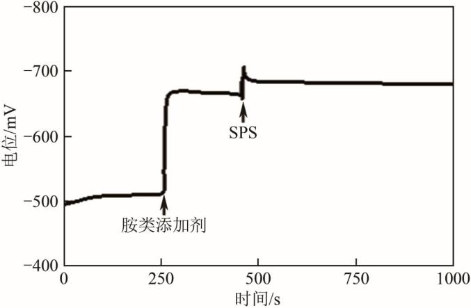 通常采取先加入胺类添加剂,稳定后再加入含硫添加剂,测定过程中用电位或电流的变化趋势来表征两种添加剂之间的相互作用情况。Broekmann等研究表明,在某胺类添加剂之后加入SPS会使电位上升一个小台阶,如图17所示,即二者存在协同作用使极化增强。图18为Lai等分别加入JGB和IMEP(咪唑与环氧氯丙烷化合物)稳定后再加入MPS的电位变化曲线,二者均和MPS有竞争作用,并且胺类添加剂结构不同,其发生拮抗作用的程度也不同。IMEP作用稳定后加入MPS,出现了瞬时的极化加强峰,即有瞬时的协同作用,而稳定后则表现为去极化。结合计算模拟结果推测:MPS首先吸附在IMEP的长链上,磺酸基对附近Cu2+的捕捉作用导致反应层的铜离子浓度降低,极化加强;后续MPS和IMEP在阴极铜表面发生竞争吸附,MPS的去极化作用更显著。而MPS的加入对于JGB出现了短暂去极化峰,稳定后并没有发生明显的去极化现象,说明二者存在竞争吸附,并且在稳定条件下,JGB的吸附作用明显大于MPS。