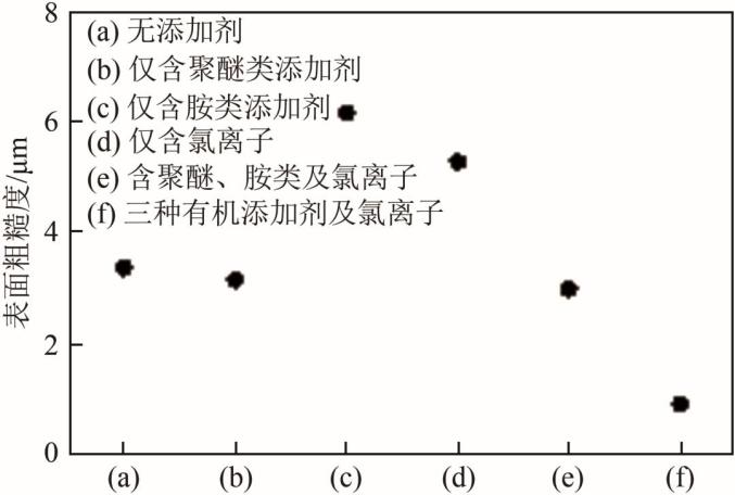 在添加剂组合中,胺类有机物多被用作整平剂,起减小表面粗糙度的作用,但其种类较多,虽然同为铵阳离子,分子的其他特征官能团及电解中其他参数均会对作用效果产生影响。因此在不同的研究中可能体现出对粗糙度和力学性能的不同影响。