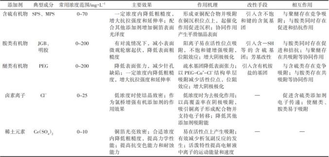 将常见电解铜箔添加剂的研究情况进行比较,可以整合获得不同典型添加剂的作用效果、机理、相互作用等信息,如表5所示。