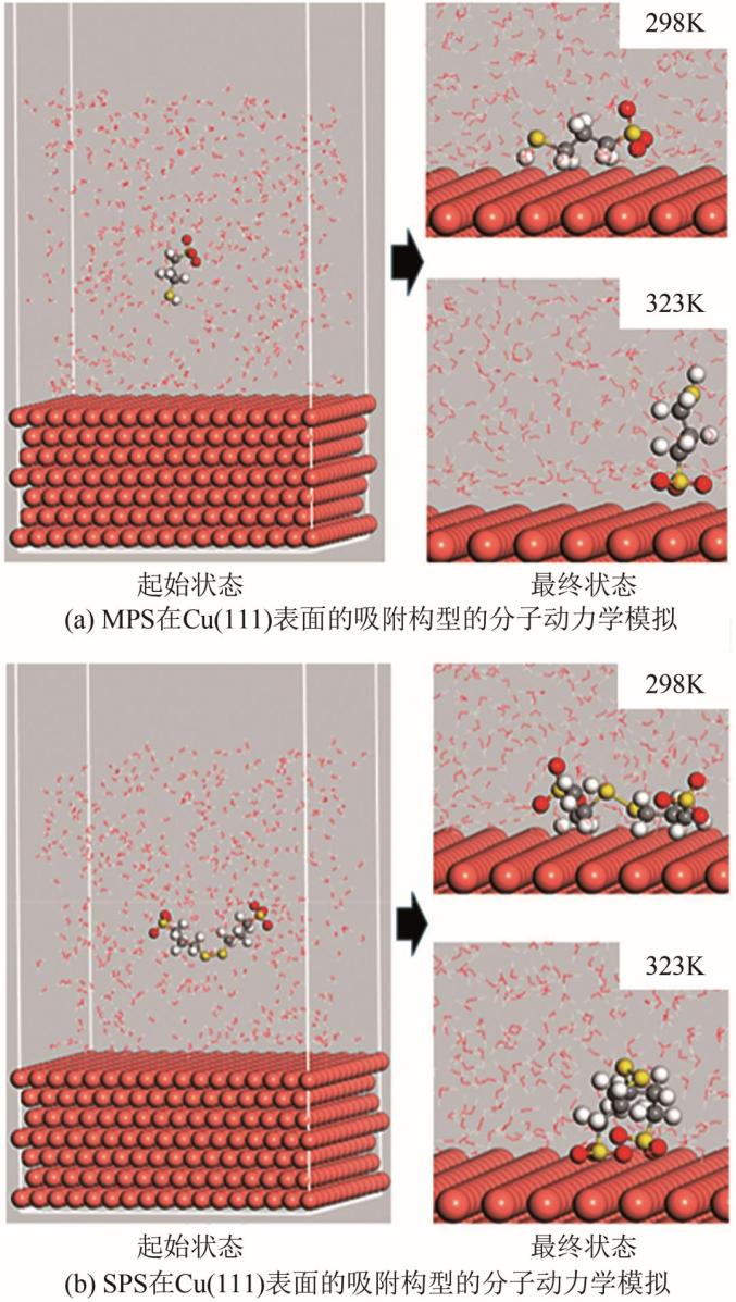 图2 MPS和SPS在Cu(111)表面的吸附构型分子动力学模拟橙色—铜原子;灰色—碳原子;白色—氢原子;黄色—硫原子;红色—氧原子
