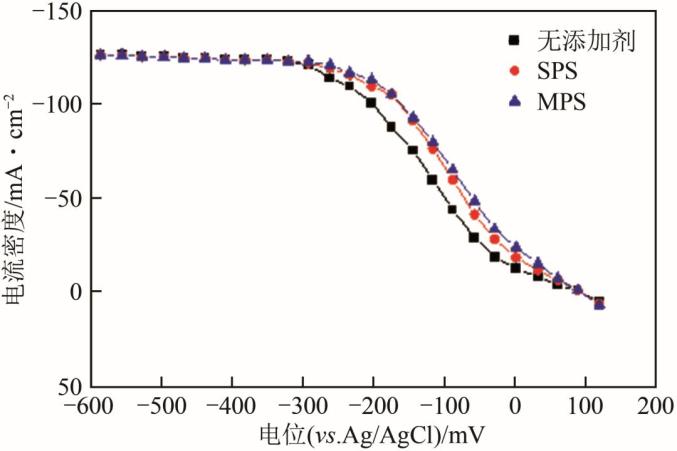 MPS和SPS作为添加剂时,对阴极电沉积反应电位的影响反馈于电化学测试中。图3中曲线分别为加入MPS、SPS和无添加剂时电沉积铜的线性扫描伏安曲线,MPS和SPS的加入都会使曲线产生正移,即发生去极化现象,对电化学反应的影响表现为加速沉积。