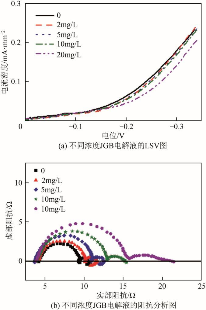 图7 JGB吸附行为JGB分子较高的能隙和在阴极表面的吸附,使得铜离子沉积需要更高的过电位,促进形核并细化晶粒。Zhang等对含不同浓度JGB的电解液进行LSV测试和阻抗分析,如图8所示,随JGB浓度的增加,极化曲线负移,阴极极化增大,沉积过电位提高。同时,JGB的加入使阻抗增大,阻碍了电荷转移过程,即增强了电化学极化。